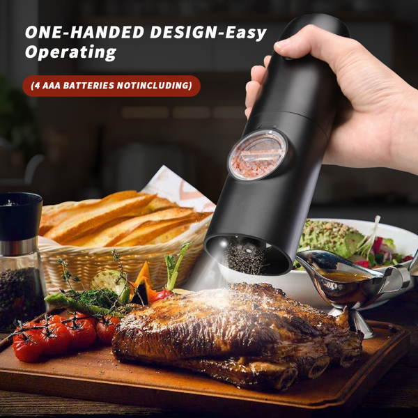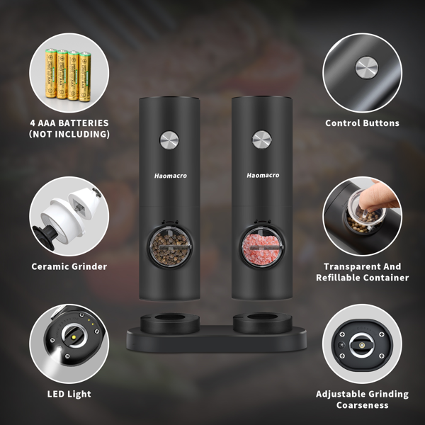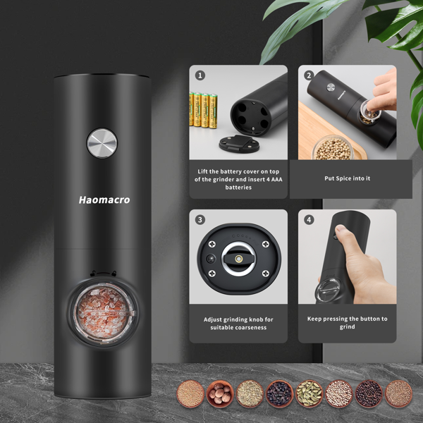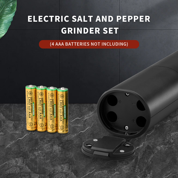 Electric salt and pepper grinder are powerd by 4 AAA Batteries(not included), making this grinder set easy to put batteries thanks to unique battery compartment. Convenient and efficient, you can use it anytime and anywhere.